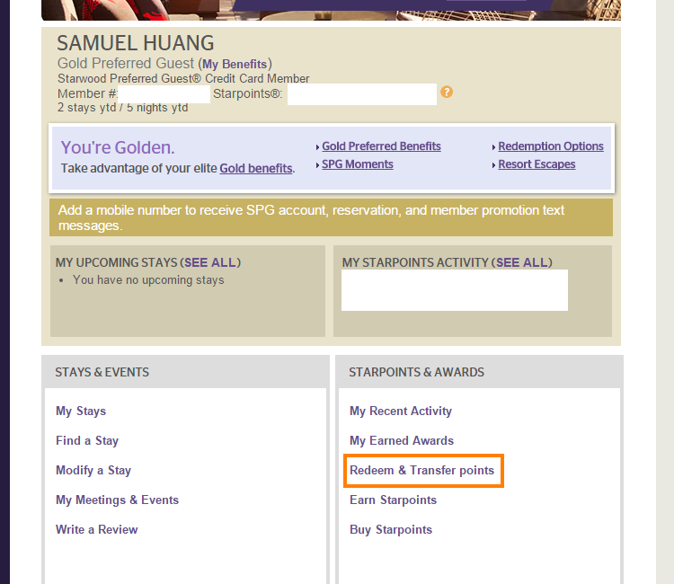 Click My Account. Under Starpoints Awards, click Redeem/Transfer points.